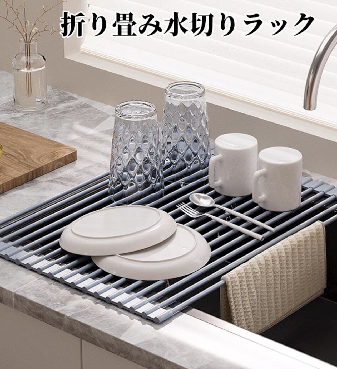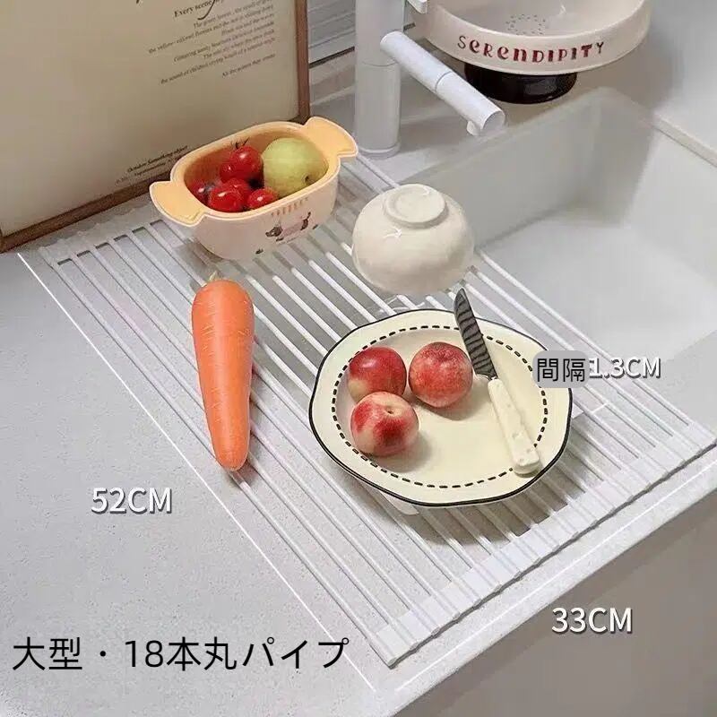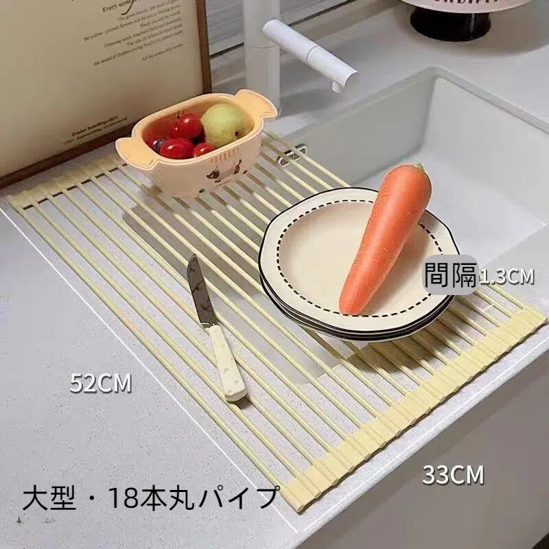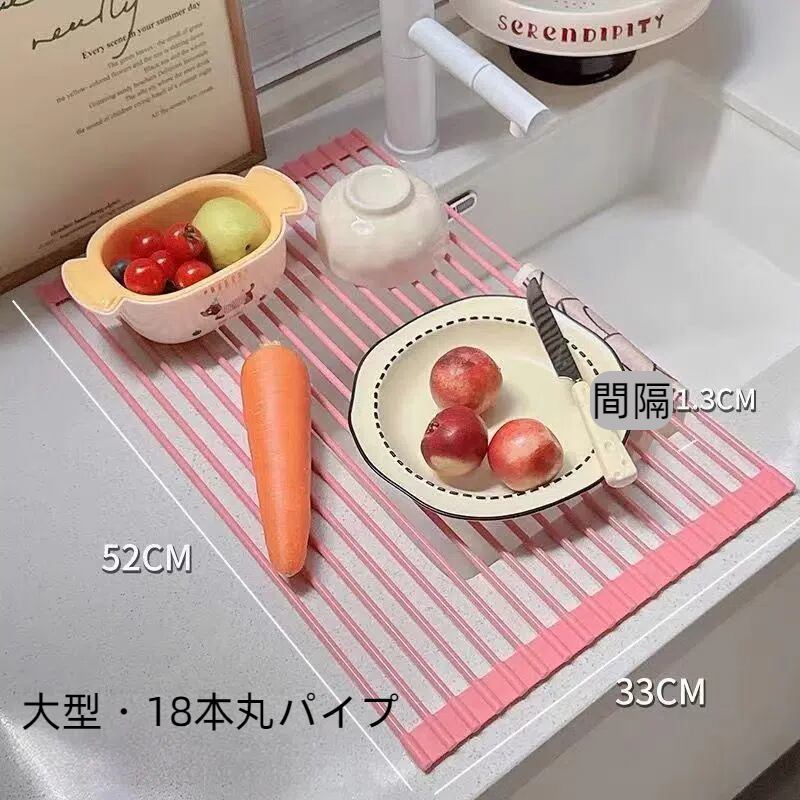 「折りたたみ式水切りロールマット シンク上カウンター収納ラック」は、キッチンにぴったりな便利アイテムです!水切りマットとしてだけでなく、カウンター収納ラックとしても活躍。シンプルで使いやすいデザインが、家事をもっと楽しくします!