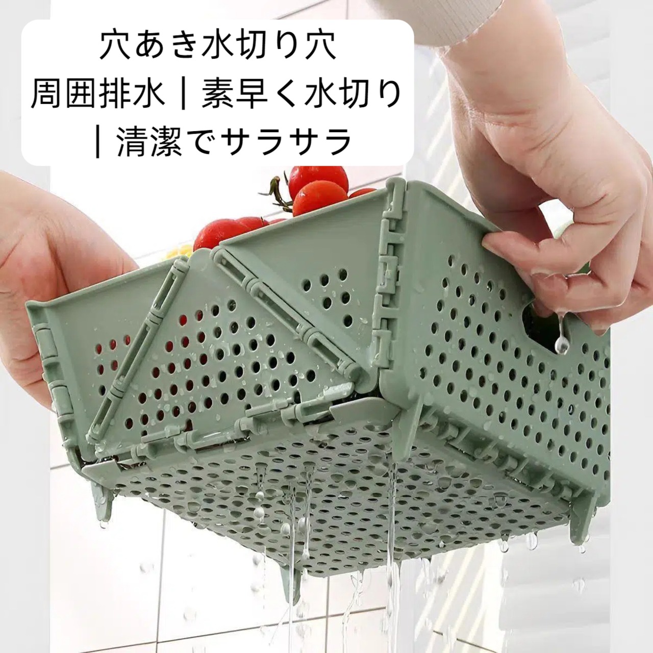 このバスケットは折りたたむことでコンパクトに収納可能!キッチンのスペースを有効に活用でき、必要なときにサッと取り出せる便利さが特長です。大容量なので、たくさんの食材も一度に洗えます。
