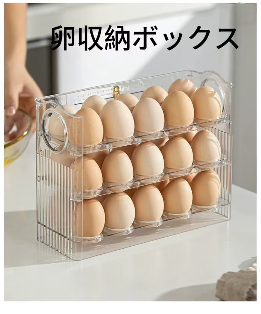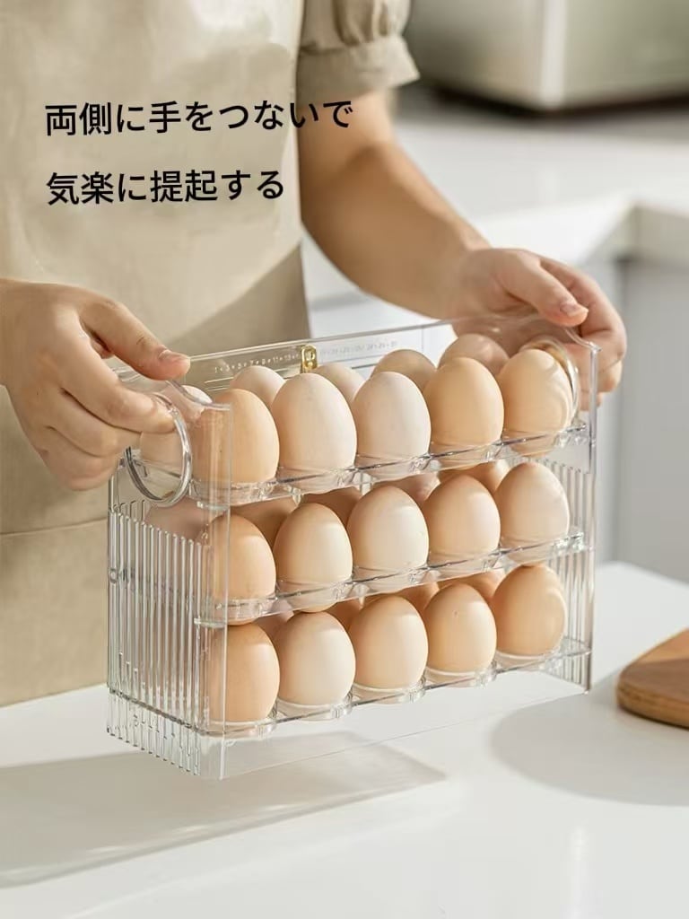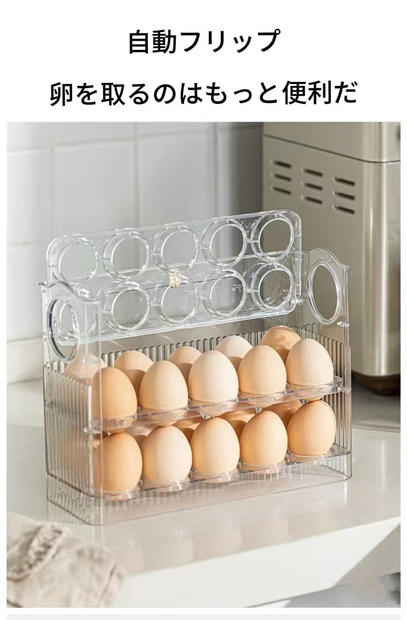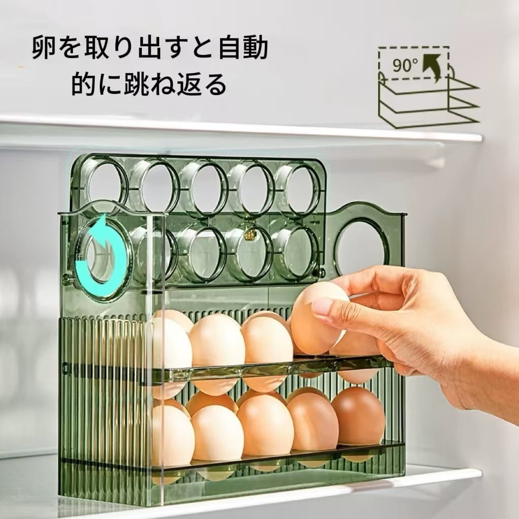 エッグオーガナイザー 冷蔵庫 サイドドア オーガナイザー オートフリップ エッグコンテナーを使って、冷蔵庫内の卵をスマートに収納しましょう!このアイテムが、あなたのキッチンを整え、生活をより快適にしてくれることでしょうので、ぜひお試しください!