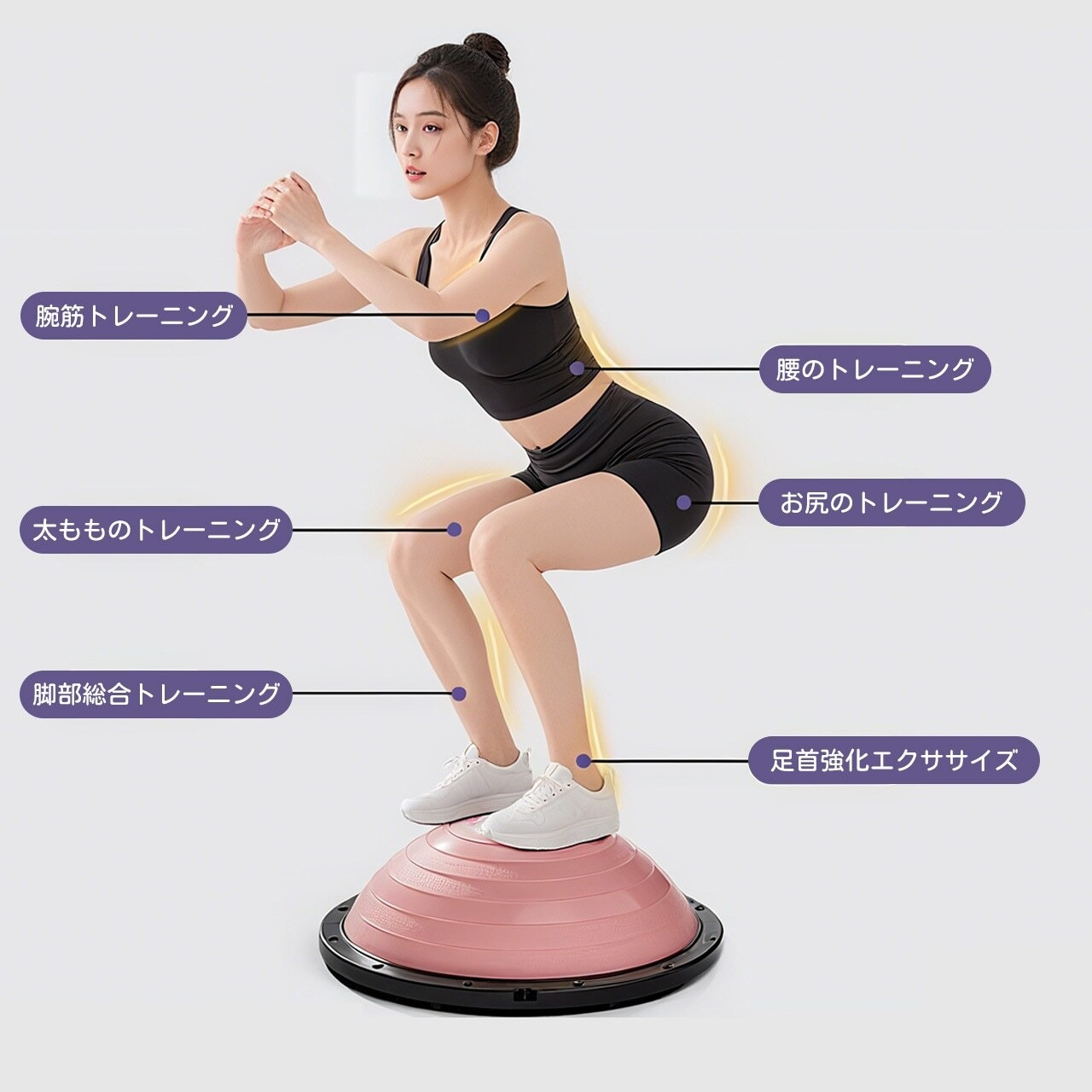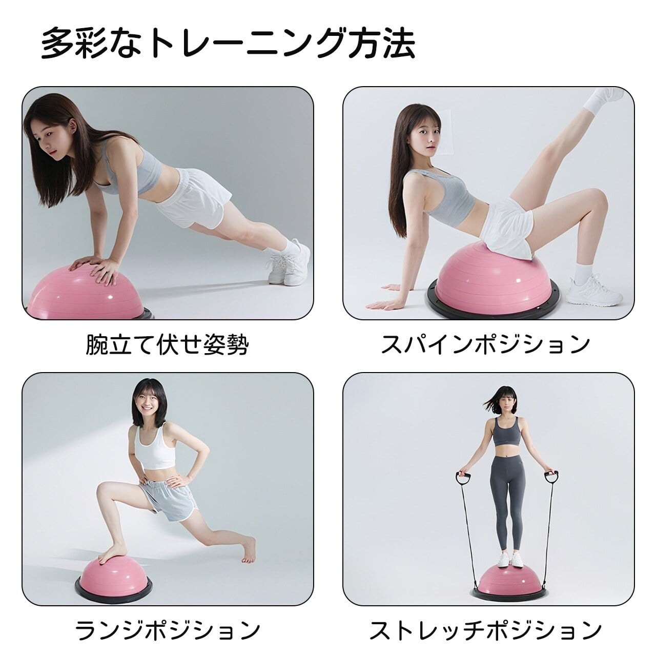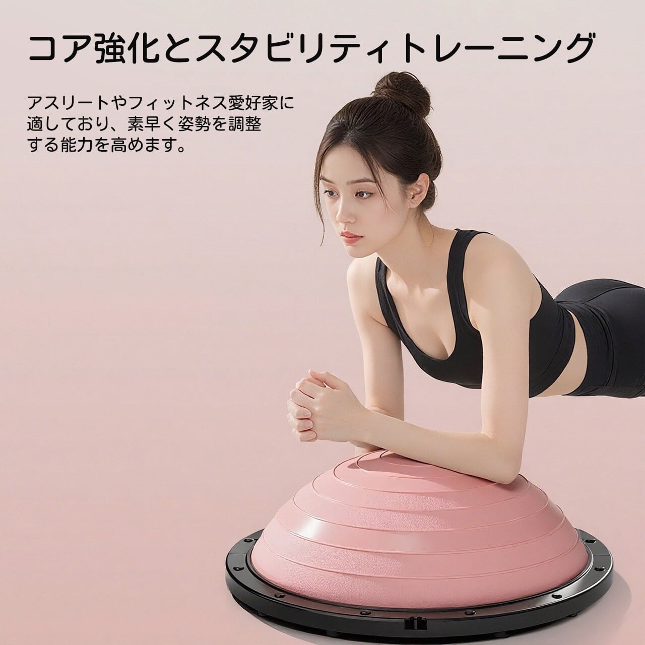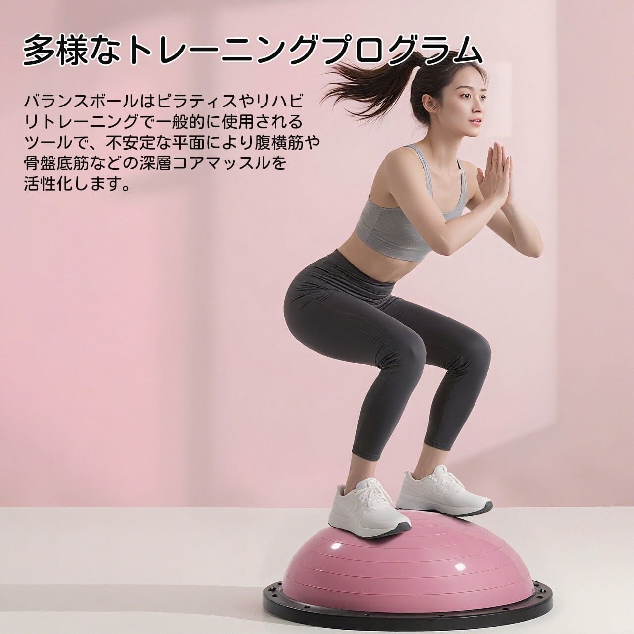 不安定な面を利用して腹横筋・骨盤底筋など深層筋群を効果的に活性化。ピラティスやリハビリにも広く使用。