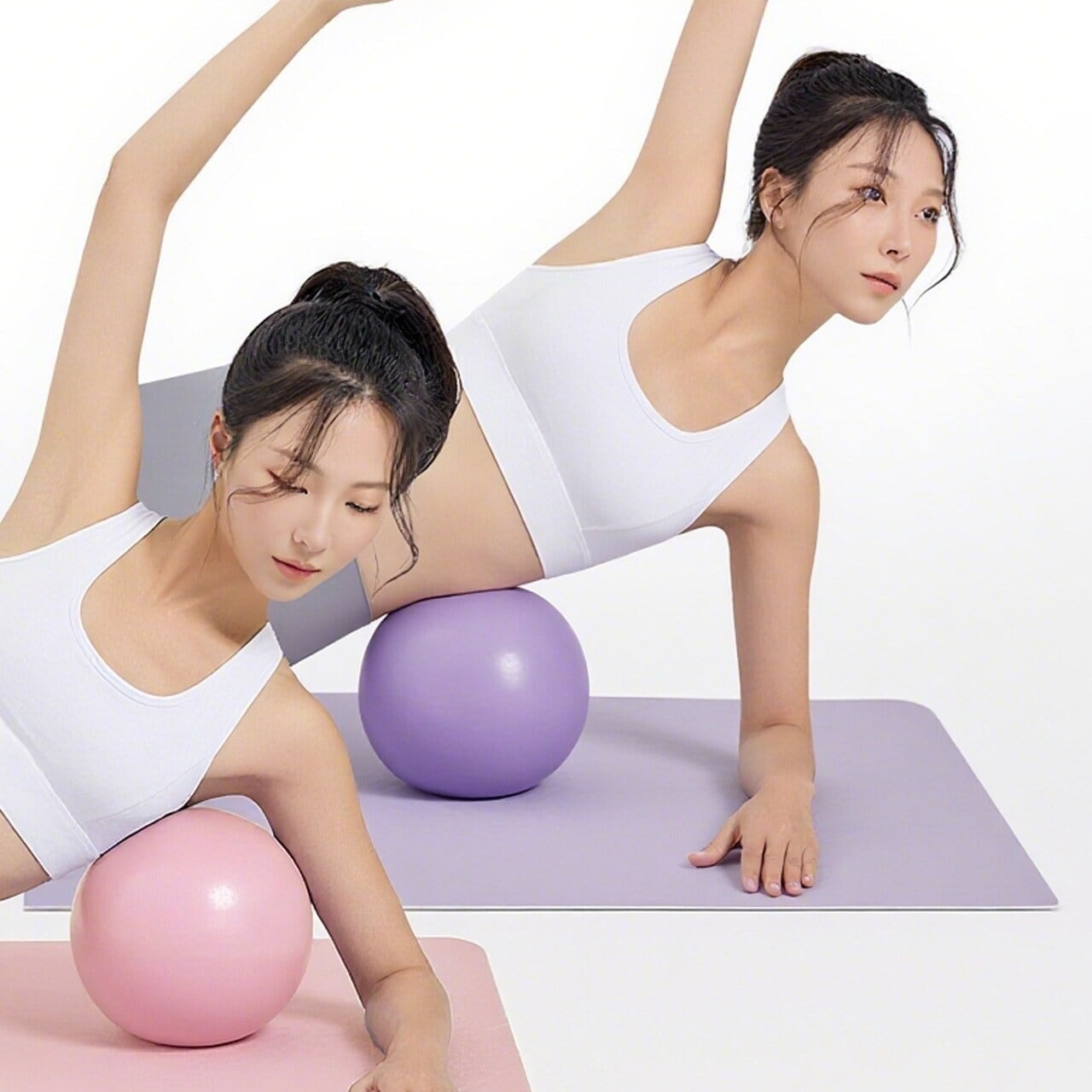 → 仰向けでボールを挟みながらクランチ。腹横筋を優しく引き締め、28日間の継続使用でウエスト-5〜8cmを実感。