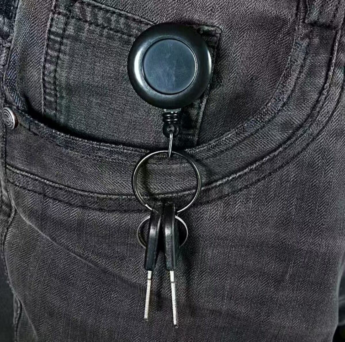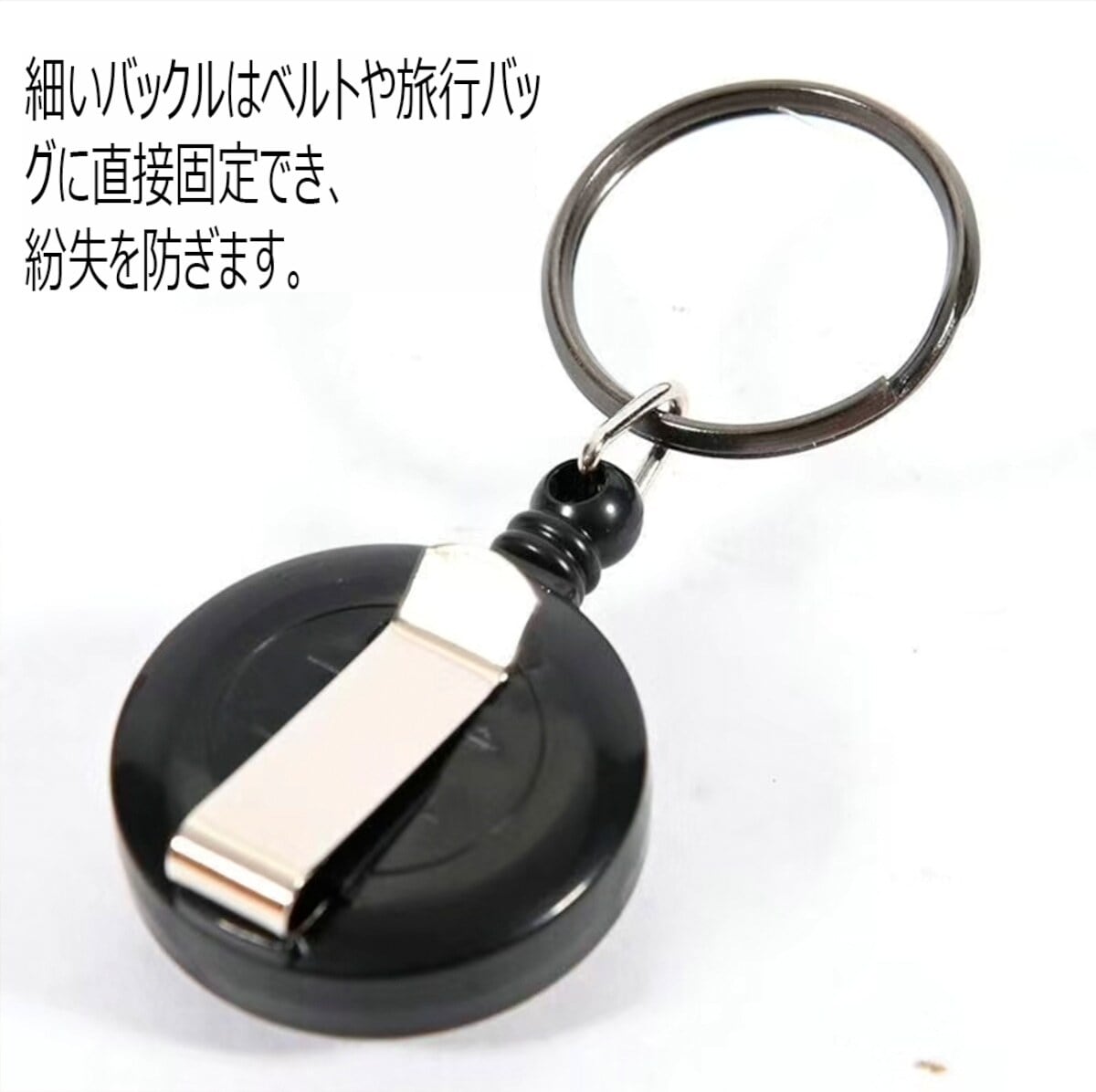 使用方法:キーリングをベルトに通し、鍵をキーリングに通して伸ばすとドアが開きます。使用しない時は手を離すと、自動的にベルトに収まり、鍵の紛失を防ぎます。