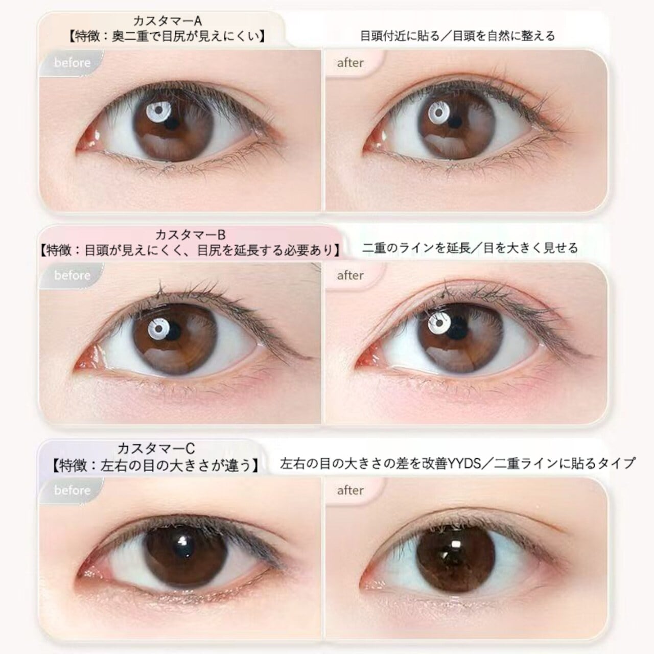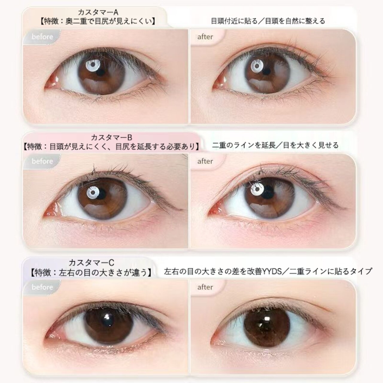 特別な日や日常のメイクアップに欠かせないアイテムです!友人とのお出かけや、ビジネスシーン、デートなど、あらゆるイベントで自信を持って過ごすためのお供として最適です。また、特にメイクに時間をかけられない忙しい朝も、このテープを使用することで、瞬時に美しい目元を演出することができます。