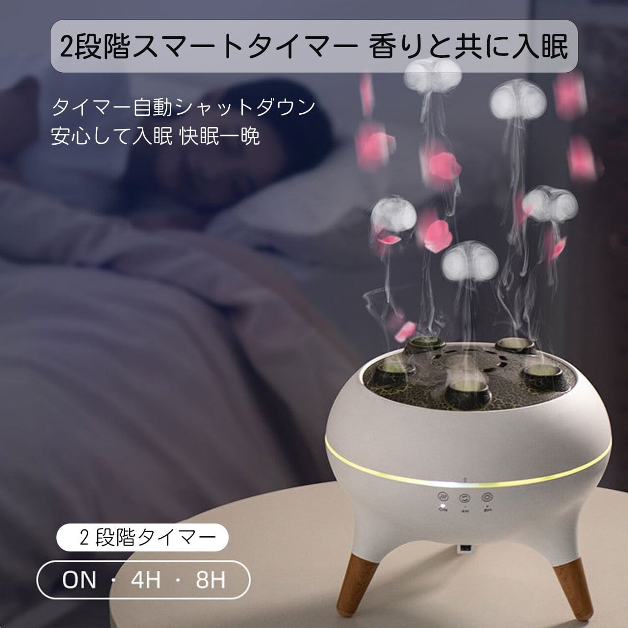 瞑想、ヨガ、リラックス時に最適な 7 種類の LED モードを搭載。自動カラーチェンジ機能でロマンチックな空間を演出し、睡眠時はライトオフ機能で睡眠を妨げず、ベビールームや寝室のナイトランプとしても安心して使用できます。明るさ調整機能付きで、シーンに合わせた柔らかな照明を提供します。