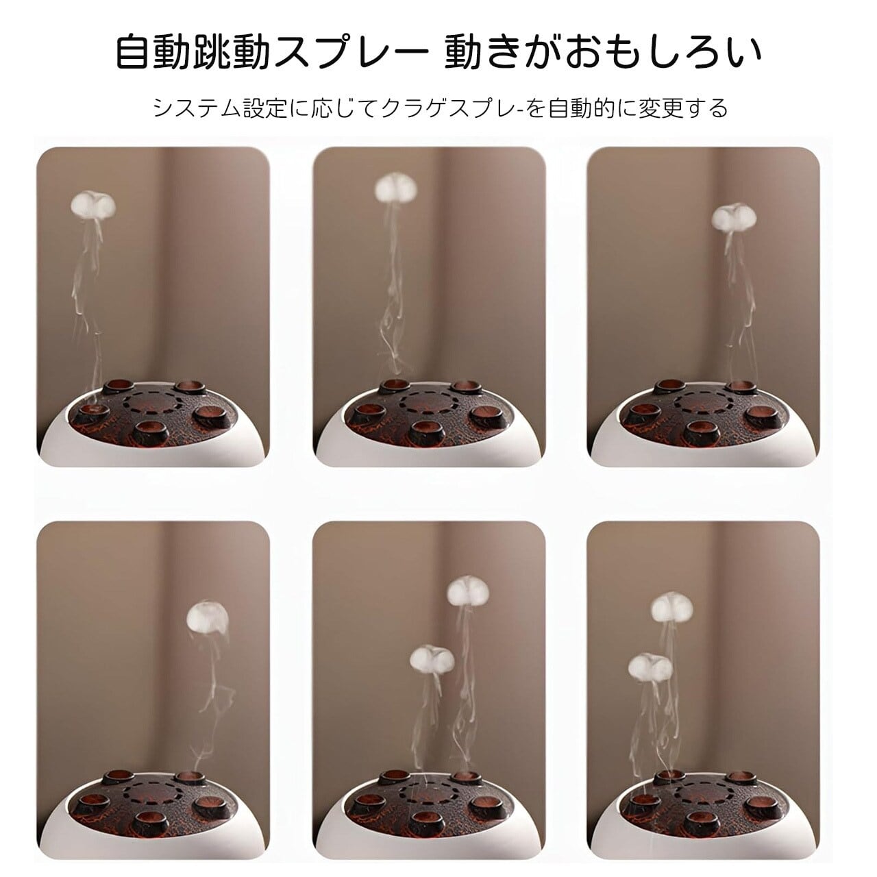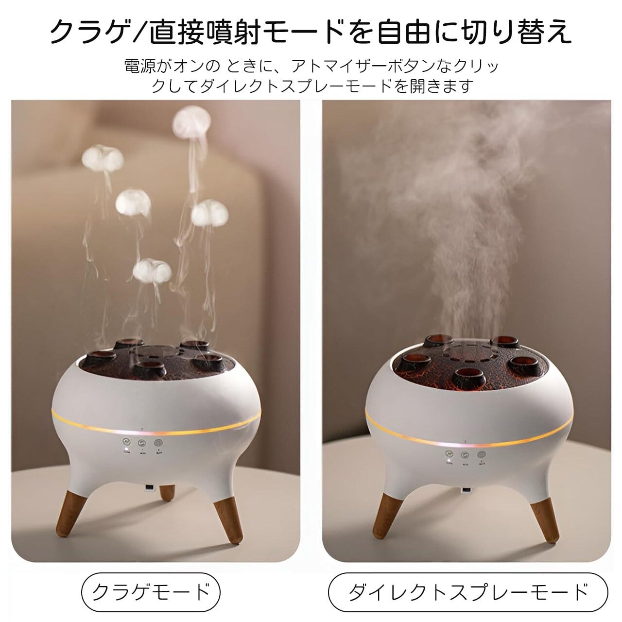 クラゲのような繊細なフレームデザインと火山の景観を融合させたユニークな造型。5 つの噴霧口から立ち上る霧化が幻想的な雰囲気を演出し、底部の木目調ディテールが高級感を際立たせています。インテリアに溶け込む北欧スタイルのデザインで、どの季節でも部屋の雰囲気を変えることができます。